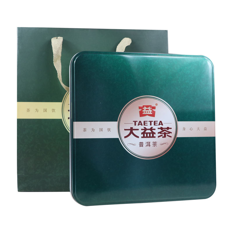 【品名】大益单饼专用礼盒(生茶专用)【规格】铁盒尺寸 长23.5cmX宽23.5cmX厚度3.5cm 手提袋尺寸 长28cmX高32cmX厚度7cm (合适装单饼357克或400克饼茶)