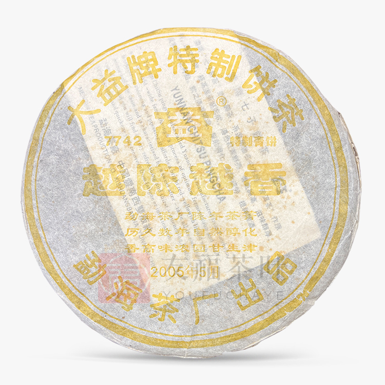 2005年大益 越陈越香7742青饼 501批 生茶 400克,05年新产品,此茶是勐海茶厂采用陈年自然醇化的老茶青为原料研制的陈韵青饼,饮时香气悠沉、口感滑爽。因产量极少,极具收藏、品饮、送礼的好茶。