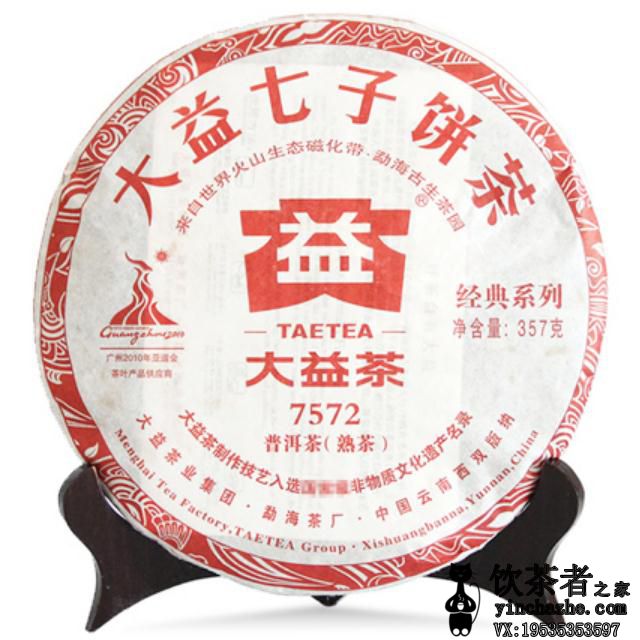 大益最具有代表性的标杆熟茶7572,典型的勐海味,正宗的普洱陈香,饼面光洁,条索清晰紧结;香气纯正,汤色红浓透亮;茶味浓厚饱满。值得推荐。大益标杆还是非常不错的,很正宗的熟茶,2010年大益 7572这款茶还是不错的,价格也不高,很适合日常的饮用消耗;饼面条索清晰,色泽褐润,金毫特显。茶汤红浓透亮,陈香扑鼻,自然舒展。滋味浓醇、顺滑,回甘生津。十年大益熟茶,干茶黑褐,条索紧实,茶汤洪亮透彻。