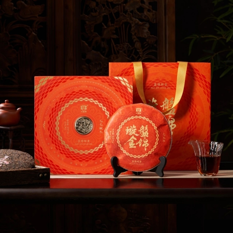盘锦璇金熟茶,精选云南大叶种晒青毛茶为原料,经国家级非物质文化遗产,“大益茶制作技艺”精制而成,充分发挥勐海茶厂五十余年熟茶发酵经验,采用“一源井”优质水源和传统“大益酵池”。