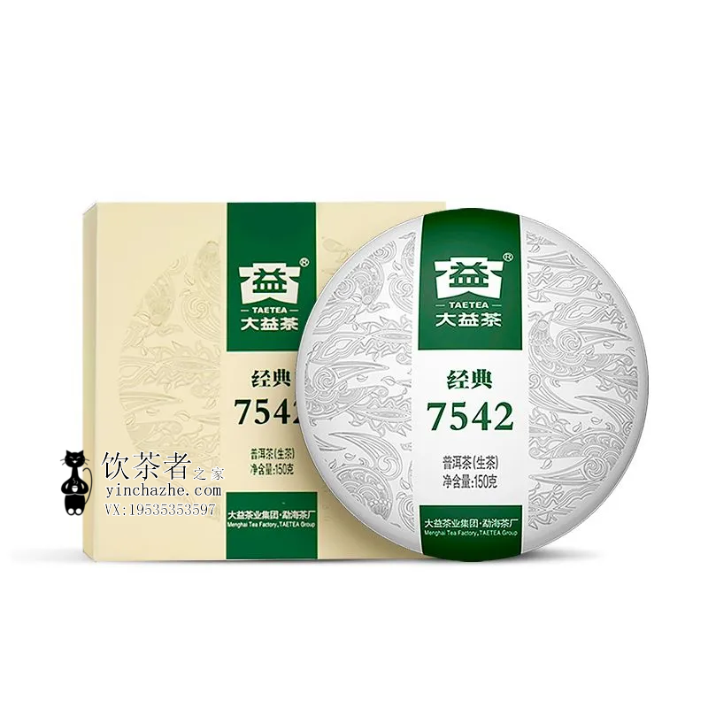 7542为大益茶业出产量较大的经典普洱生茶,以肥壮茶箐为里,幼嫩芽叶为撒面,研配得当,面茶色泽乌润显芽毫,心茶肥壮,散花果香之气,经典配方7542被市场誉为“评判普洱生茶品质的标杆产品”。