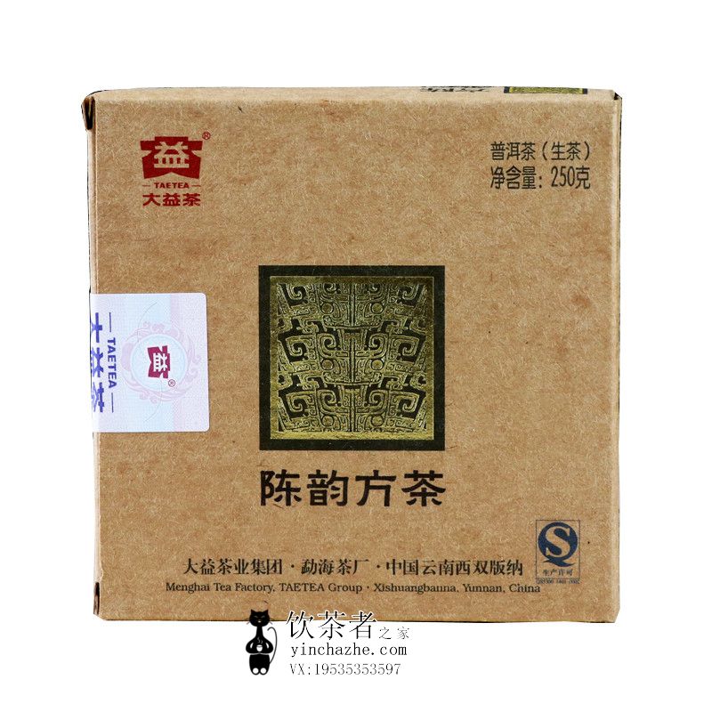 2013年大益 陈韵方砖 301批 生茶 250克,2013年陈韵方茶选用高等级拼配陈年茶菁制作,芽头多,筛分均匀,等级均匀,叶底肥厚,嫩度高,香气好,茶气浓郁,苦重,散的快,涩轻,回甘好。耐冲泡度很好。250克规格,压制紧实,方正。正面“大益”标志,反面“陈韵方茶”。牛皮纸盒包装,烫金图案,精致高档。