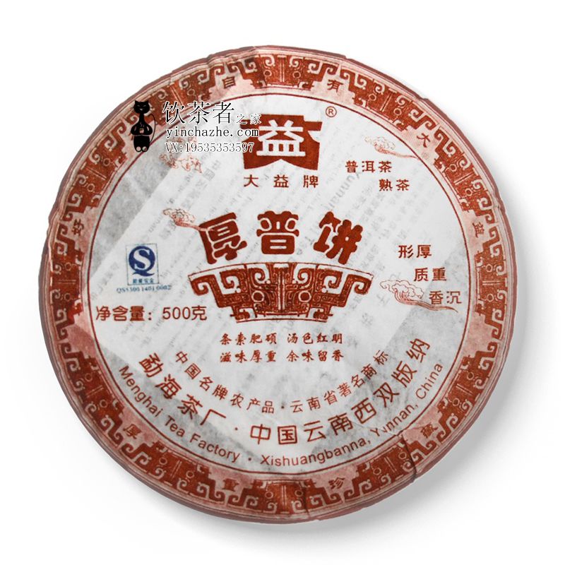 2007年大益 厚普饼 熟茶 500克 饼,厚普饼是勐海茶厂2007年新产品,精选勐海地区大叶种高档茶菁,依传统工艺晒、揉、渥堆、发酵、压制而成。饼形整齐,条索肥硕显毫,汤色红艳,滋味甘甜,香滑顺甜,甘醇绵厚。
