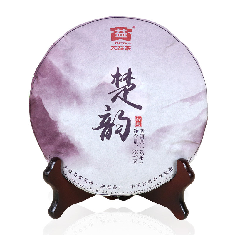 2016年大益 楚韵 1601批次 熟茶 357克 饼,大益楚韵——紫气东来 独领风骚:产品以尊贵紫色为色调,饼型圆润饱满,松紧适宜,撒面均匀,金毫显露。开汤后,汤色红亮,滋味浓酽,口感醇厚顺滑,略甜,泡到后更感觉甜水,细品水路细滑,香气细腻,叶底色泽褐红,是大益熟茶中的“风骚”之作,是一款不错的好茶,值得收藏,品饮。
