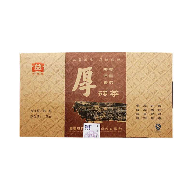 2006年,勐海茶厂为力传承砖茶的优良历史,设计制作了2000克厚砖。熟砖是传统的粗叶配方,用料紧细,产品制形紧实,但内部又具有一定的透气性,宽厚外形,醇厚内质,滋味醇厚清甜,汤色红浓明亮,口感饱满。