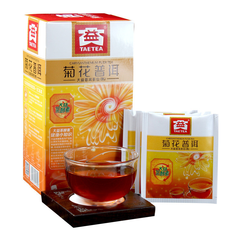 大益菊花普洱熟茶选用杭白菊和品质普洱为原料,将普洱的香醇融入菊花的香气,香醇怡神。采用袋泡便携装,卫生方便。此款菊花普洱含有茶酵素,并且将普洱的香醇融入菊花的独特香气,口感醇厚。每盒40g,内含1 6g小袋装共25袋,一袋一泡,小巧、卫生、方便。
