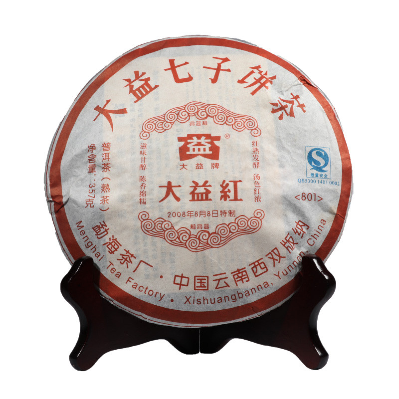 2008年大益 大益红 熟茶 357克 饼,大益红,条索紧结匀整,饼型圆润,汤色红浓,滋味浓醇,口感甘醇、爽滑,陈香绵糯。