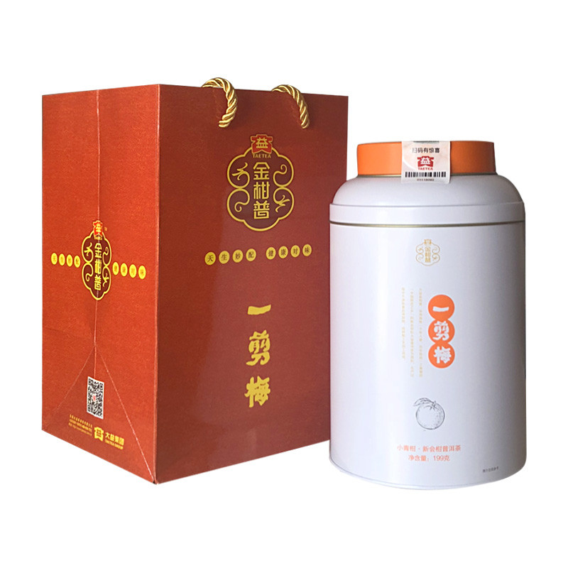 大益 金柑普(小青柑) 一剪梅 熟茶 199克 罐,罐装正面:此款茶品为柑普茶散茶,铁罐包装。手提袋:购买此199克桶装,配有手提袋,方便馈赠亲友。罐装封囗:罐装封口处贴有大益防伪标签,可让茶友辨别真伪。
