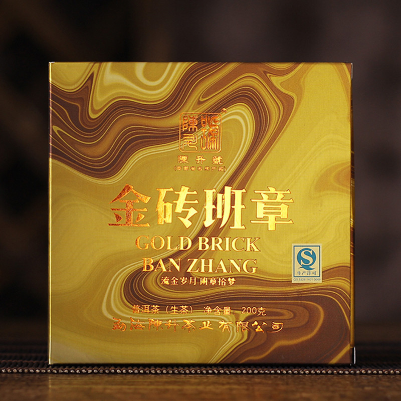 2017年陈升号 金砖班章 生茶 200克 砖,金砖班章有着超高的外表颜值,砖形周正,薄厚适宜,干茶条索肥硕粗壮,色泽黑褐油润;茶汤金黄明亮,兰香、蜜香馥郁,茶汤厚重饱满,茶气刚烈,山野气韵明显,回甘生津不断,叶底柔软,富有弹力。
