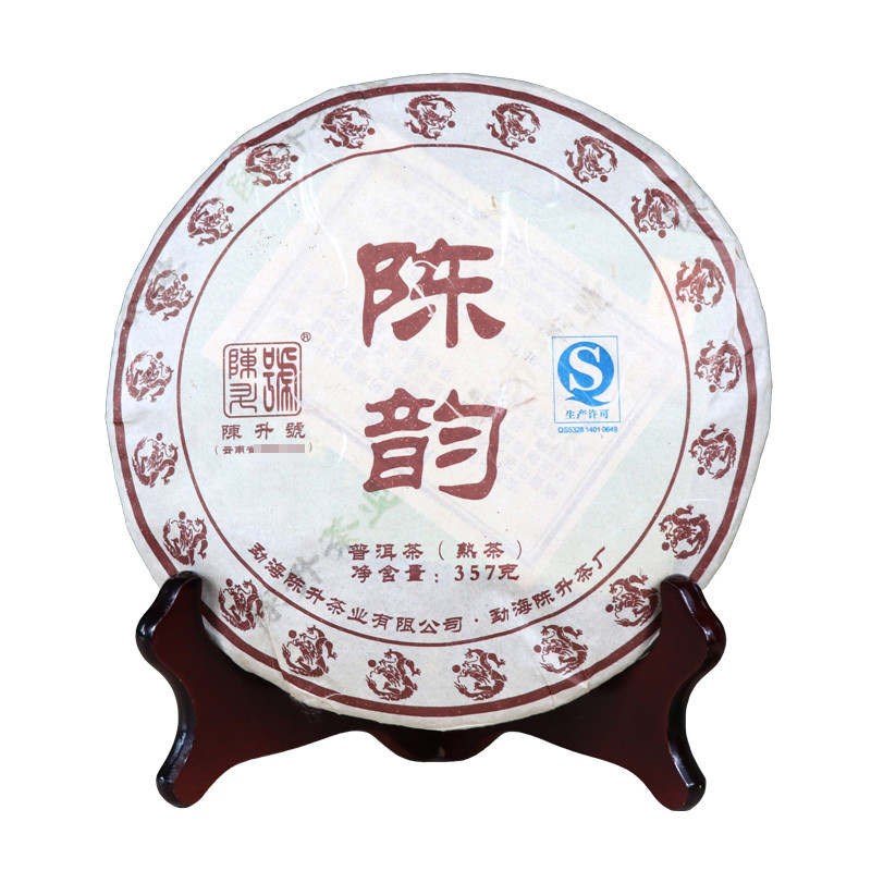 2012年陈升号 陈韵 熟茶 357克 饼,陈韵属陈升号熟茶系列经典产品之一。该茶甄选云南大叶种晒青毛茶为原料,适度发酵,存放三年以上,精心压制而成,陈香气独特、口感醇厚、丝滑,回甘好,汤色透亮。