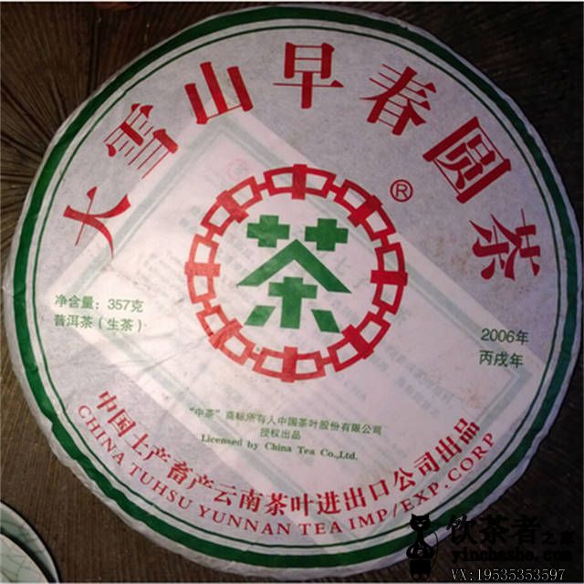 中茶牌2006年大雪山早春圆茶357克生茶饼,高端精品,云南大叶种晒青茶叶。九年陈,中茶大品牌,再加上原料珍贵,当年的生产量也极少,造就了这款稀世珍品。尤其难得是多年来仓储于宜良县狗街镇,由于气候干燥,成就了绝对的干仓好茶,真真保留了大雪山早春的气息和八年的陈韵,尤为难得的好普洱。